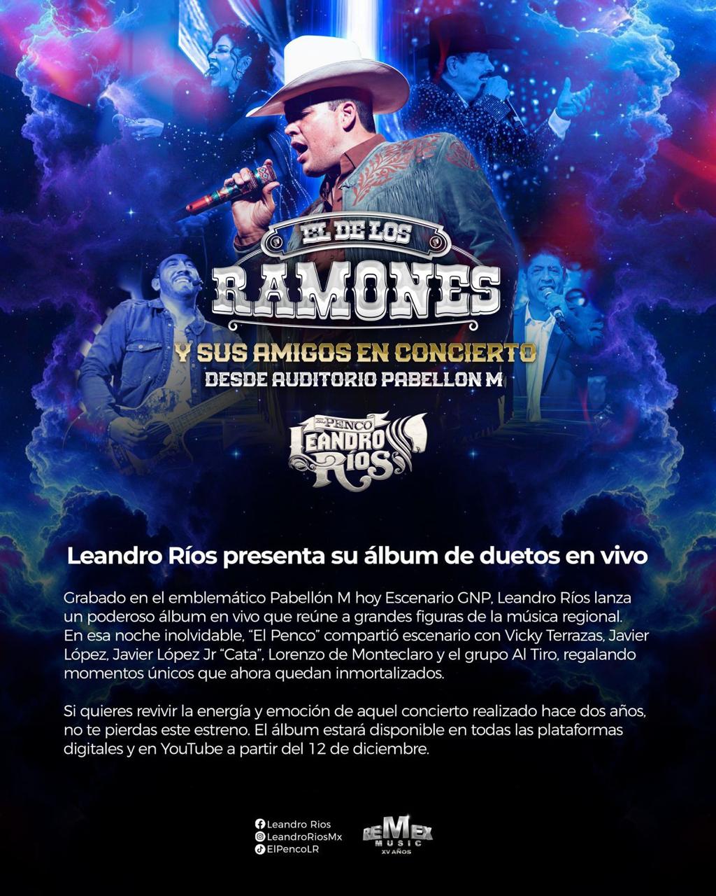 Grabado en el emblemático Pabellón M hoy Escenario GNP, Leandro Ríos lanza un poderoso álbum en vivo que reúne a grandes figuras de la música regional. En esa noche inolvidable, “El Penco” compartió escenario con Vicky Terrazas, Javier López, Javier López Jr “Cata”, Lorenzo de Monteclaro y el grupo Al Tiro, regalando momentos únicos que ahora quedan inmortalizados.